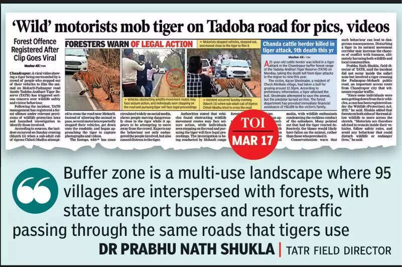 Nagpur: The Tadoba-Andhari Tiger Reserve (TATR) administration decided to station a dedicated patrol vehicle on the Padmapur-Moharli road and install CCTVs at around 10 sensitive tiger crossing points in the buffer periphery following Sunday’s incident in which tourists stepped out of their vehicles to film a tiger on the public road.A viral video from the Sunday incidents shows a sub-adult cub of tigress Chhoti Madhu attempting to cross the Padmapur-Moharli road even as people got dangerously close to the animal with phones in their hands. TATR registered a forest offence under the Wildlife (Protection) Act, 1972.TATR field director Dr Prabhu Nath Shukla said the Padmapur-Moharli stretch was the most sensitive tiger crossing corridor and warranted a permanent patrol presence. “A vehicle dedicated solely to patrol this stretch will ensure a faster response when animals are on the road and deter visitors from stopping or alighting,” Shukla said. He added that live CCTVs feeds would be monitored from the TATR control room, allowing real-time intervention.Shukla clarified the incident was not from the safari zone but from a public road. The buffer zone, he noted, is a multi-use landscape where 95 villages are interspersed with forests, with state transport buses and resort traffic passing regularly through the same roads that tigers use as movement corridors. Shukla said, “Public roads providing connectivity to these villages pass through this area, and state transport corporation buses operate on them. Since resorts are located outside the forest, both tourists and local residents frequently travel through the buffer. As forests exist on both sides, wild animals crossing the road is a regular occurrence.”He added that existing safety infrastructure on the road includes vehicle inspection and tourist registration at Padmapur check post. “There is a second check post near Moharli, where team patrols to prevent vehicles from stopping inside forest stretches, no-entry barriers at every forest entry point and fire line, and round-the-clock patrolling by protection hut workers and fire watchers. Night patrols are also conducted and unauthorised movement draws immediate action,” said Shukla.